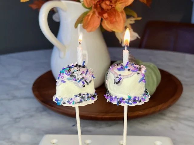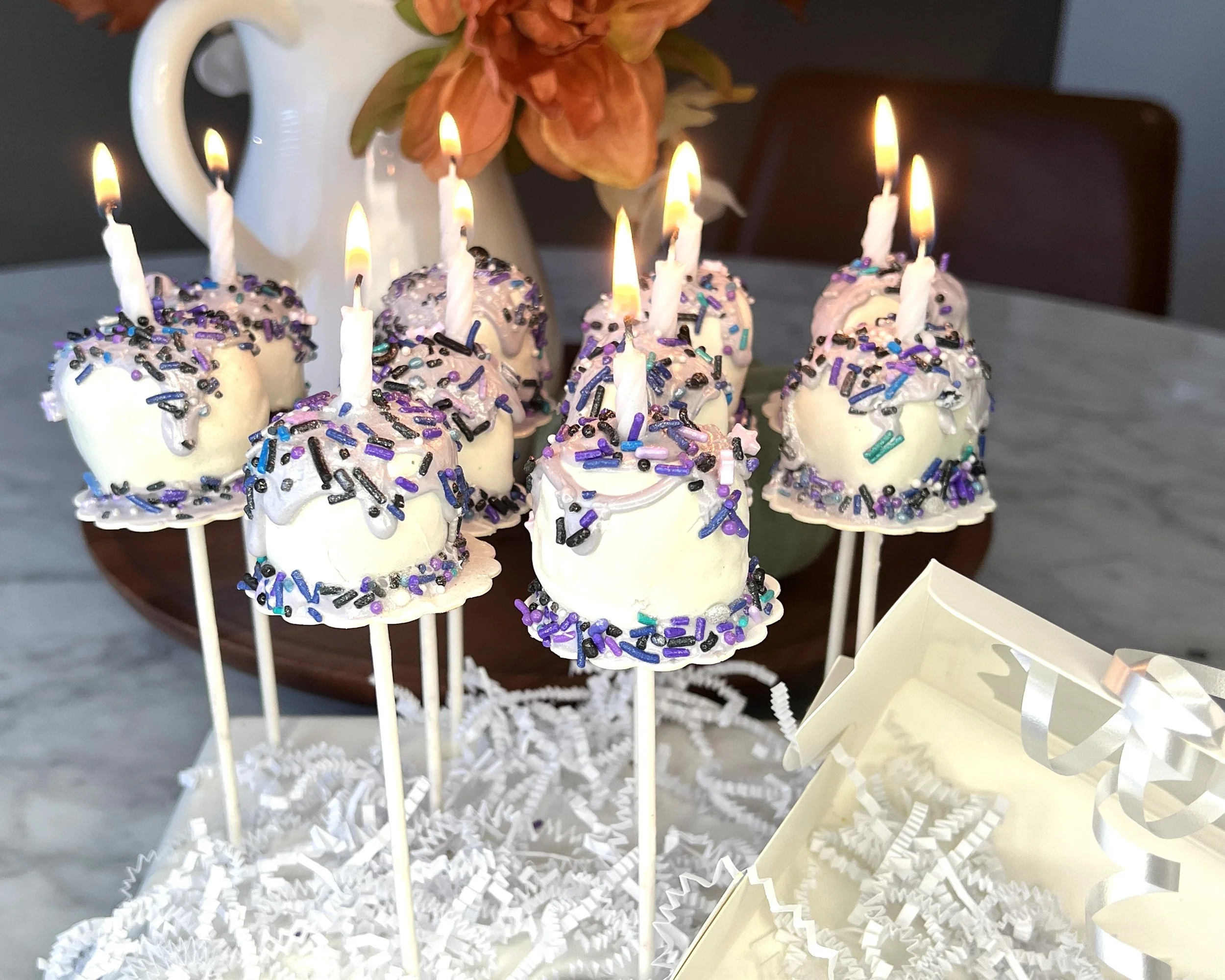 Who wouldn’t love a mini birthday cake or a mini slice to celebrate someone special (or just yourself)! These little cuties are sure to please with colorful icing swirls, sprinkles, vanilla cake and a real candle to top them off!